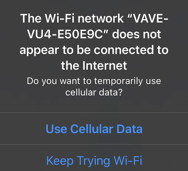 The iOS message indicates that when the Vave app connects to the ultrasound probe, it disconnects you from your regular Wi-Fi network, which is connected to the Internet, and connects you to the probe’s Wi-Fi network. This probe’s Wi-Fi is a direct connection between your mobile device and the ultrasound probe, not connected to the Internet. Once your Apple device detects a lack of internet connection, it displays the message above. However, an internet connection is not required during scanning. After scanning is complete and you disconnect from the probe, the Vave app will restore you to your original Wi-Fi network.